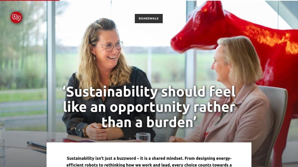 Sustainability isn’t just a buzzword – it is a shared mindset. From designing energy-efficient robots to rethinking how we work and lead, every choice counts towards a more sustainable future. In this conversation, our Chief Financial Officer Maartje and Head of Sustainability Tanja reflect on how we can all make a difference. They talk about turning ambition into action, our Environmental, Social and Governance (ESG) goals, and how diversity and inclusion play a vital role in creating real impact. For the future of farming – and for Lely itself.