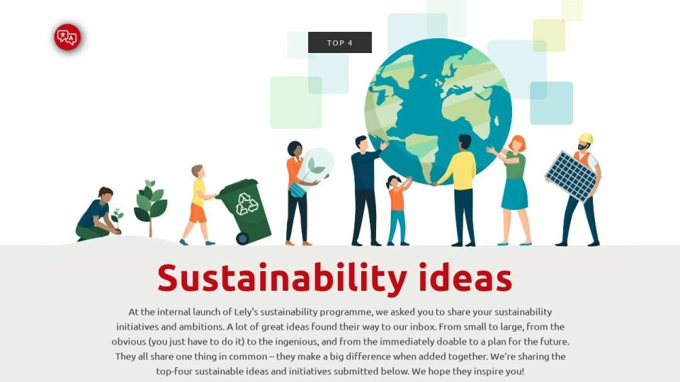 At the internal launch of Lely's sustainability programme, we asked you to share your sustainability initiatives and ambitions. A lot of great ideas found their way to our inbox. From small to large, from the obvious (you just have to do it) to the ingenious, and from the immediately doable to a plan for the future. They all share one thing in common – they make a big difference when added together. We’re sharing the top-four sustainable ideas and initiatives submitted below. We hope they inspire you!